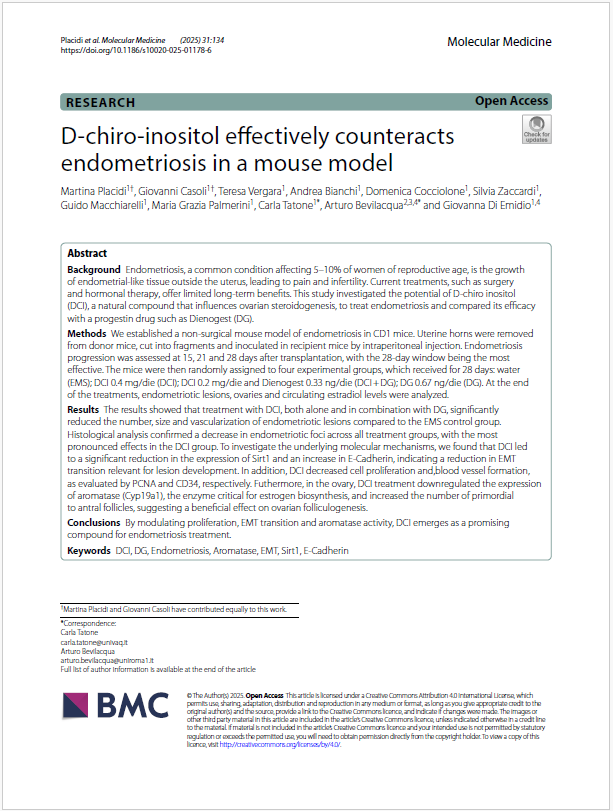 Results: The results showed that treatment with DCI, both alone and in combination with DG, significantly reduced the number, size and vascularization of endometriotic lesions compared to the EMS control group. Histological analysis confirmed a decrease in endometriotic foci across all treatment groups, with the most pronounced effects in the DCI group. To investigate the underlying molecular mechanisms, we found that DCI led to a significant reduction in the expression of Sirt1 and an increase in E-Cadherin, indicating a reduction in EMT transition relevant for lesion development. In addition, DCI decreased cell proliferation and,blood vessel formation, as evaluated by PCNA and CD34, respectively. Futhermore, in the ovary, DCI treatment downregulated the expression of aromatase (Cyp19a1), the enzyme critical for estrogen biosynthesis, and increased the number of primordial to antral follicles, suggesting a beneficial effect on ovarian folliculogenesis.